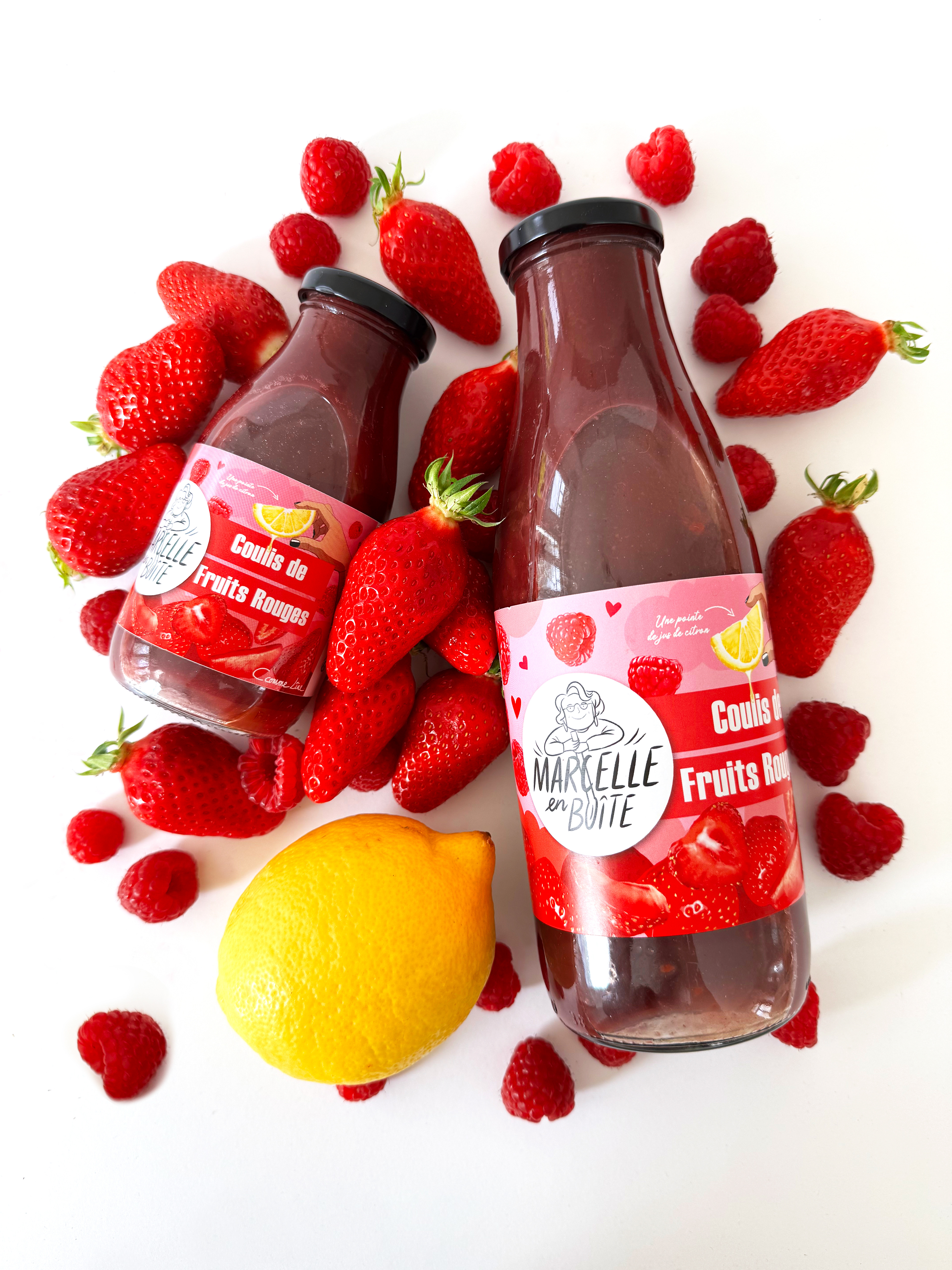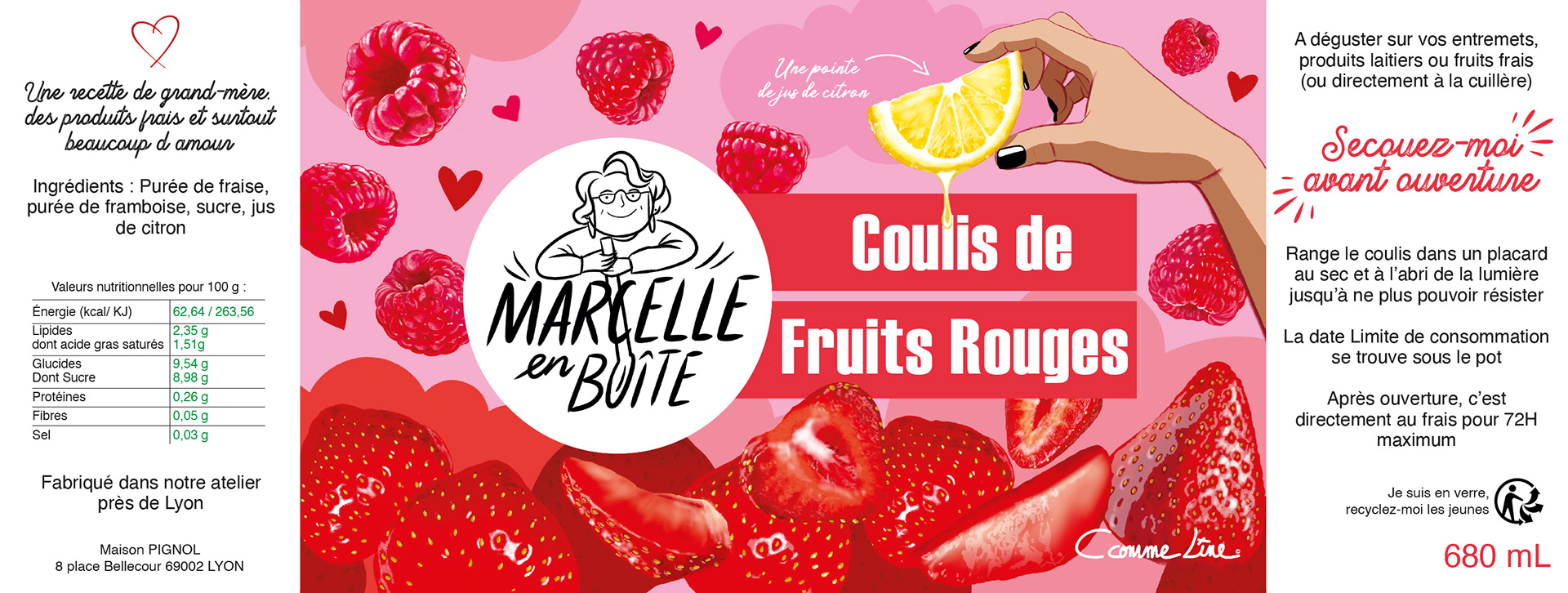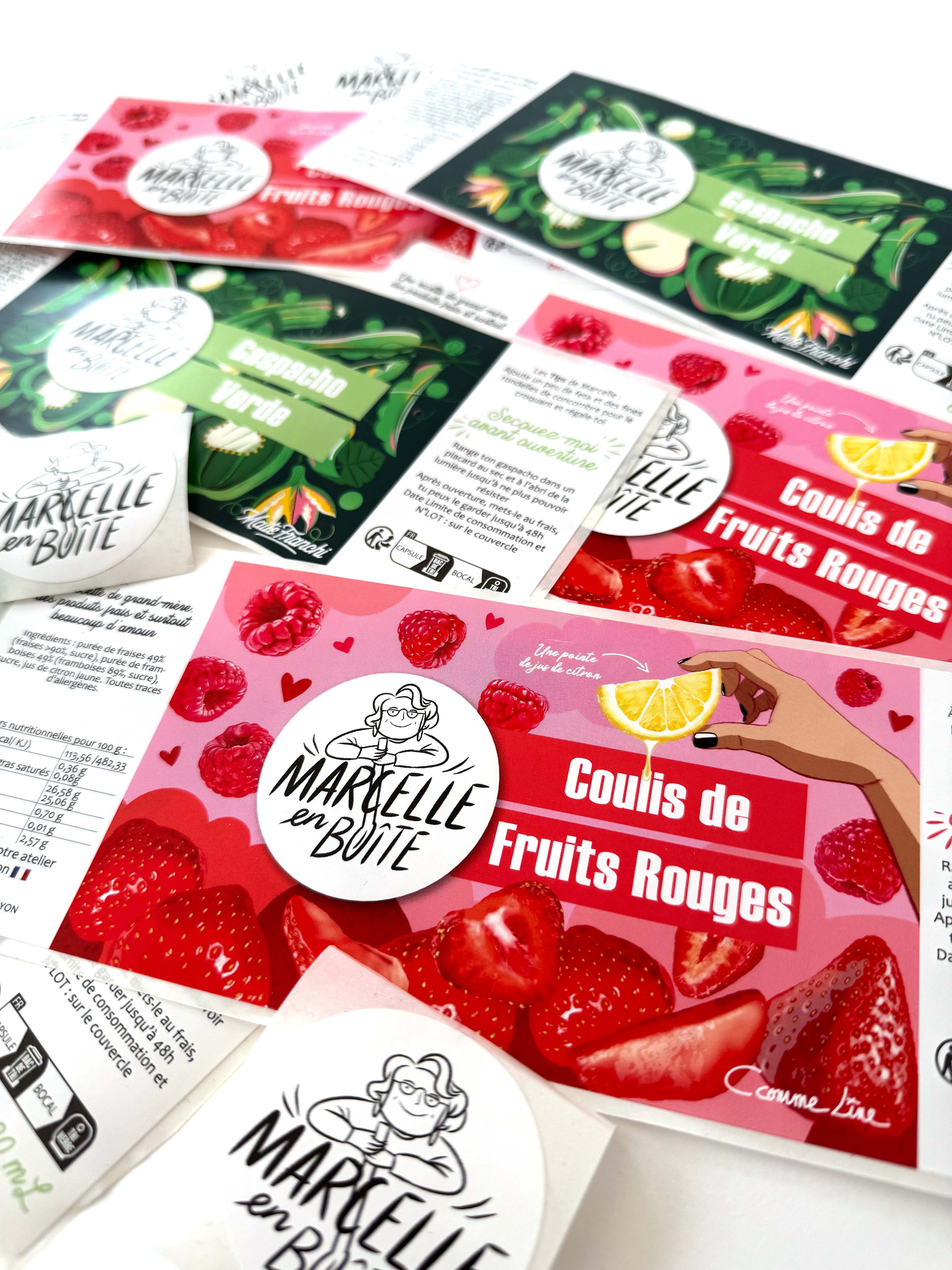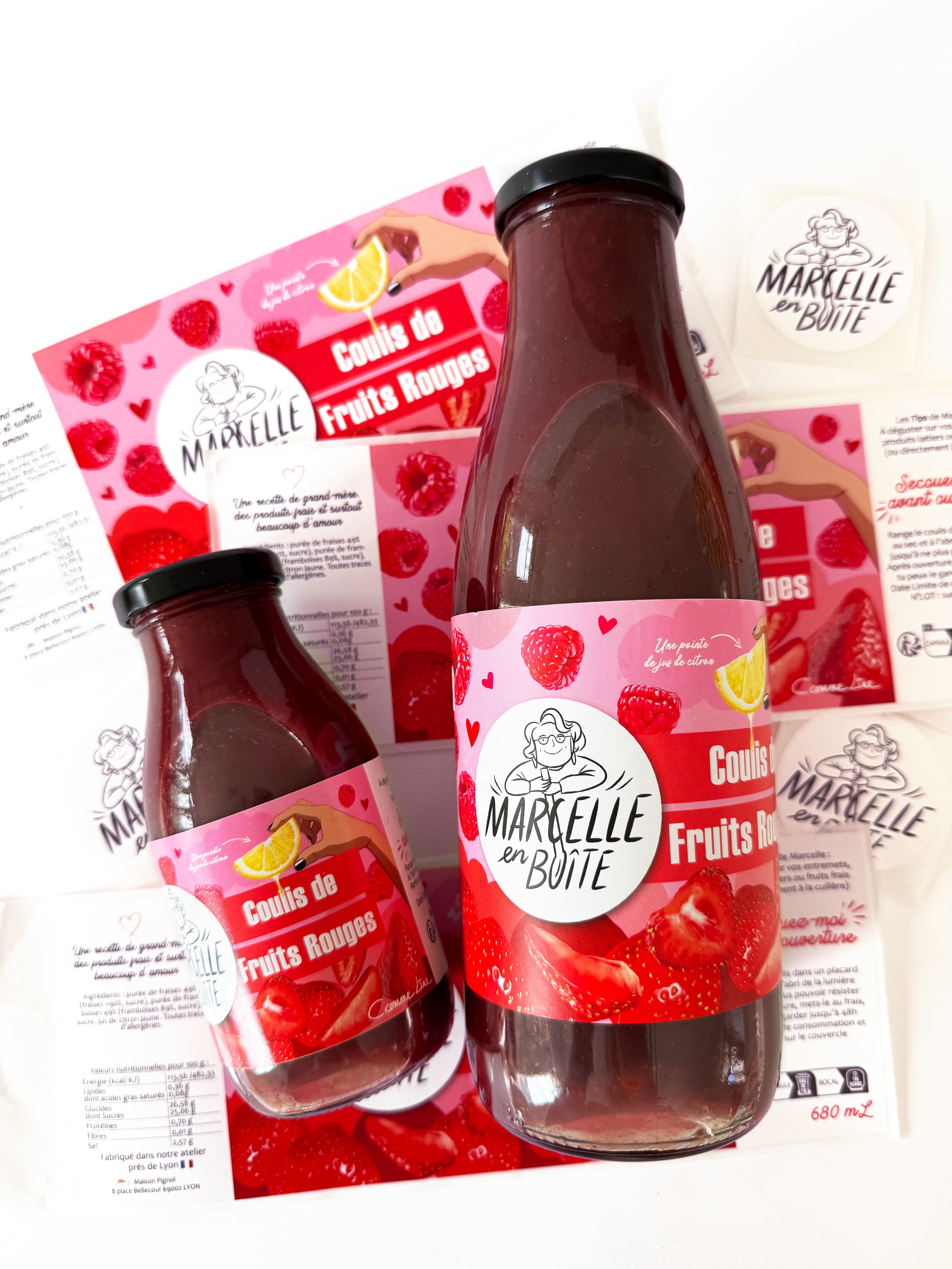 Illustrations et création de l'étiquette des 2 formats pour le coulis de fruits rouges MARCELLE EN BOÎTE - MAISON PIGNOL (LYON)